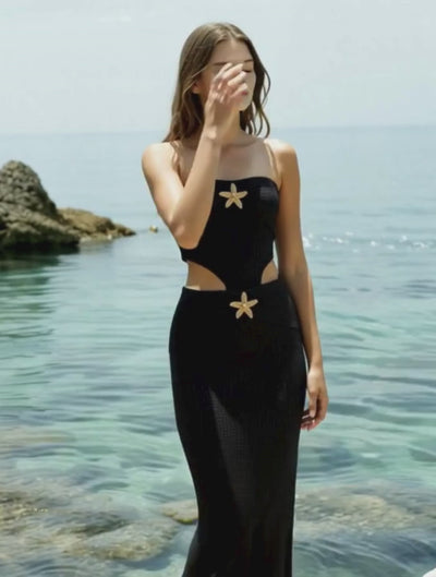 The dress is crowned with two meticulously placed starfish embellishments — striking, golden accents that evoke the untamed beauty of the ocean’s edge. Their placement adds both structure and statement, transforming the piece from simple eveningwear into a modern coastal masterpiece.