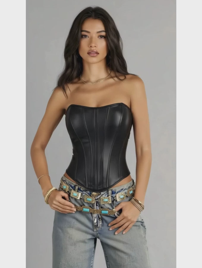 Turn up the edge with the Noir Sculpt Corset Top. Crafted from sleek vegan leather, this structured piece contours your curves with a bold, figure flattering silhouette. The sweetheart neckline adds a touch of femininity, while the sculpted seams deliver that confident, cinched-in look. Perfect for pairing with tailored pants, statement skirts, or denim for a night out , this corset is your go to for modern glam with attitude.