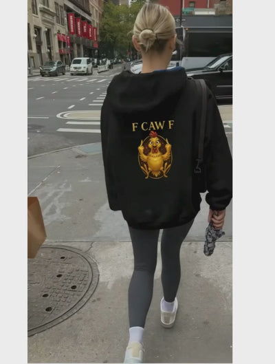 Make a bold, playful statement with the F CAW F Hoodie — where attitude meets effortless style. This chic black T-shirt features a striking golden rooster crest and the tongue-in-cheek “F CAW F” slogan, perfect for those who walk with confidence and a wink of humor. Crafted from soft, breathable cotton with a modern fit, it’s your go-to piece for casual days, streetwear looks, or layering under a blazer for a fun fashion twist.